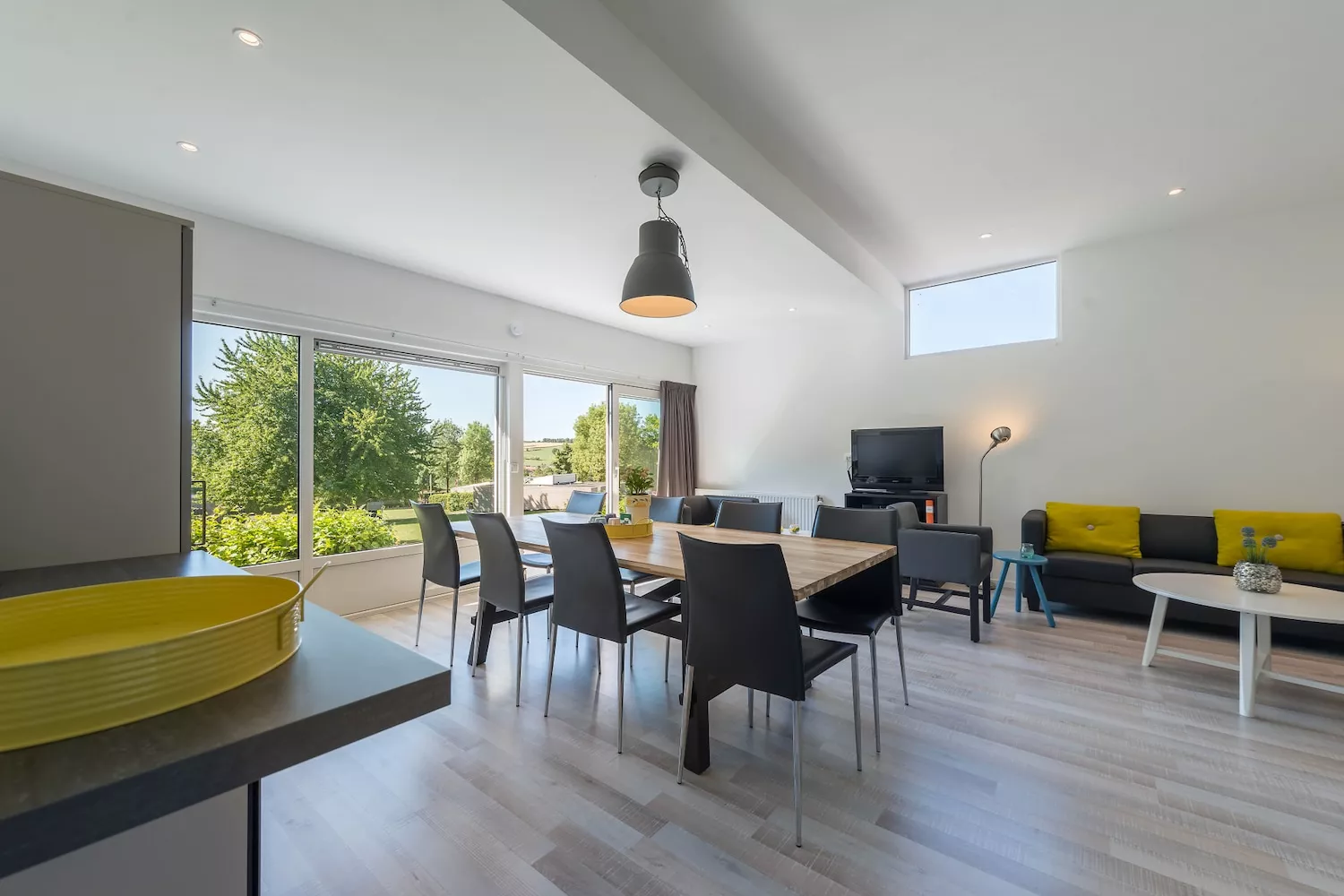 De Circle Lodge is een moderne, gelijkvloerse accommodatie voor 10 personen. Het is echt een bijzonder groepshuis dat helemaal rond is, en heel veel natuurlijk licht heeft. Deze vrijstaande lodge van 129 m² heeft 5 slaapkamers met extra lange boxspringbedden (210 cm) en maar liefst 3 badkamers met inloopdouche, plus 2 aparte toiletten. Alle badkamers hebben vloerverwarming. De open keuken is uitgerust met een kokend water kraan, Nespresso, vaatwasser en 4-pits elektrische kookplaat. Ook de woonkamer heeft vloerverwarming en een smart-tv. Op het terras geniet je van het prachtige uitzicht over het heuvellandschap. Let op: parkeren doe je op de centrale parkeerplaats. In sommige accommodaties zijn honden toegestaan.