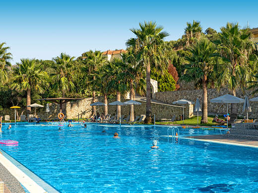 Het grote zwembad heeft een ondiep kindergedeelte waar de kleintjes veilig kunnen spelen. Op de ligbedjes geniet je van de Griekse zon, en als het te warm wordt pak je gewoon een parasol erbij. De jongste gasten kunnen zich uitleven in de speeltuin. Heb je zin om actief bezig te zijn? Het hotel heeft twee tennisbanen waar je tegen betaling je opslag kunt oefenen. De omgeving leent zich ook uitstekend voor wandelingen en uitstapjes naar nabijgelegen strandjes.