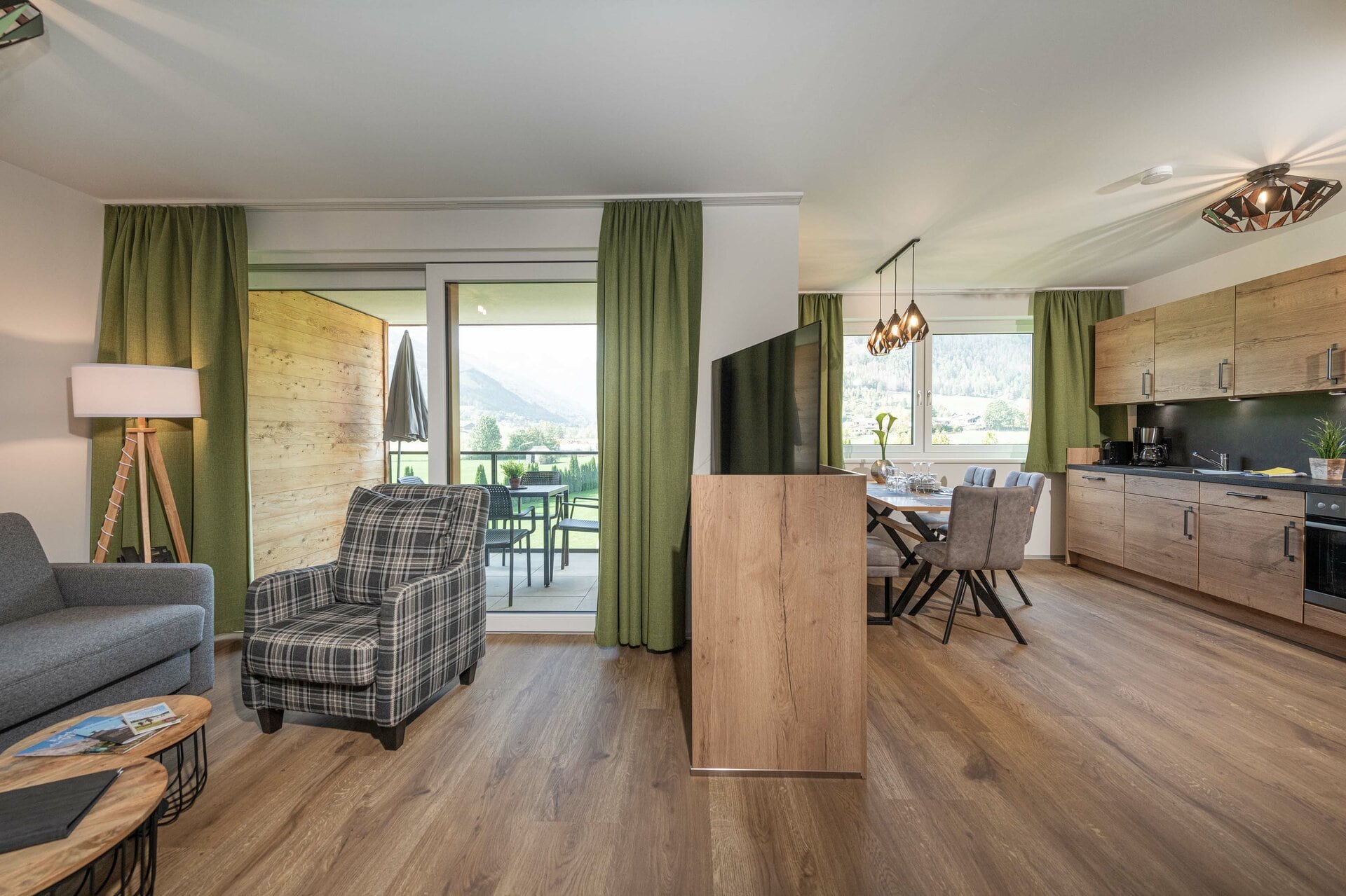 Op de tweede verdieping vind je het Apartment Comfort met Privésauna van 73 vierkante meter. De indeling is vergelijkbaar met het Classic-type – twee slaapkamers, twee badkamers, privésauna, uitklapbare slaapbank voor twee extra personen – maar dit appartement heeft een lcd-tv met radio en ligt een verdieping hoger. Weer een verdieping naar boven, op de derde etage, ligt het Apartment Superior met Privésauna van 75 vierkante meter. Ook hier slaap je in twee slaapkamers, beschik je over twee badkamers en een privésauna, en heb je een comfortabele woonruimte met volledig uitgeruste keuken. Het topmodel is het Apartment Penthouse met Privésauna op de vierde verdieping, met 83 vierkante meter woonoppervlak en een groot dakterras met panoramisch bergzicht. Net als de andere grote appartementen heeft het Penthouse twee slaapkamers, twee badkamers, een privésauna en een uitklapbare slaapbank voor maximaal zes personen. Het verschil zit ‘m in de locatie en het spectaculaire dakterras, waar je ’s avonds met een glas wijn kunt nagenieten van je dag in de bergen. Alle appartementen hebben een smart-tv of lcd-tv, gratis wifi, en een hoogwaardige inbouwkeuken met moderne apparatuur en kookgerei.