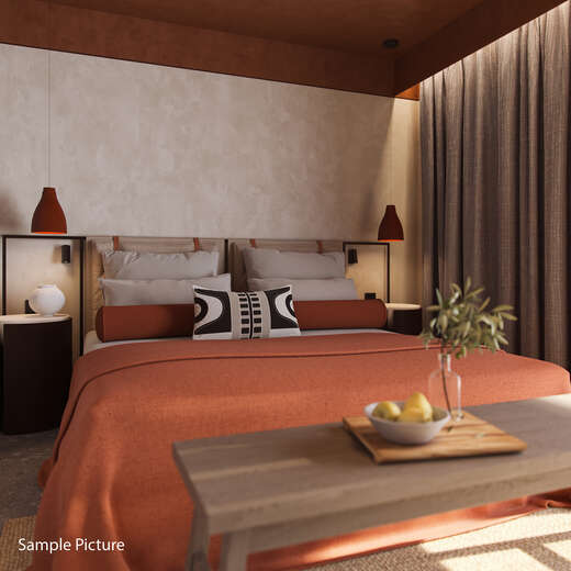 • Tweepersoonskamer (circa 25 m²): Moderne inrichting met een comfortabel tweepersoonsbed, perfect voor een romantisch verblijf met z’n tweeën.