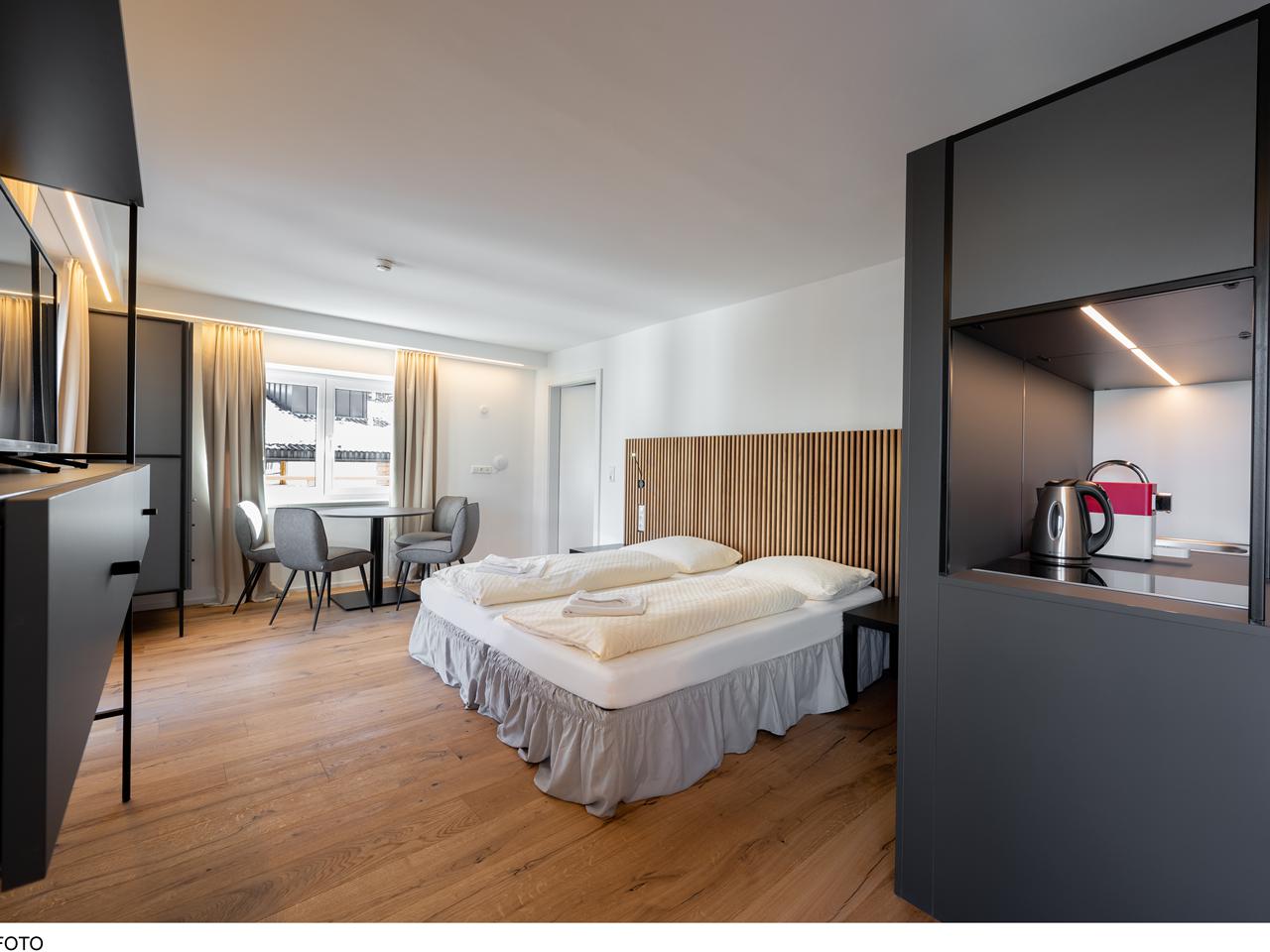 - Het Appartement Single beslaat 30 m² en is speciaal ontworpen voor solo-reizigers. Je slaapt hier op een luxe boxspringbed van 140×200 cm en beschikt over een moderne badkamer met een regendusche inclusief handdouche, een apart toilet en een föhn. De kitchenette is voorzien van 2 gratis koffiecapsules, en je hebt een gezellige eethoek waar je kunt genieten van je ontbijt of een snelle lunch. Het balkon heeft een tafel en stoel met uitzicht op de bergen. Een hotelsafe zorgt voor de veilige opslag van je waardespullen.