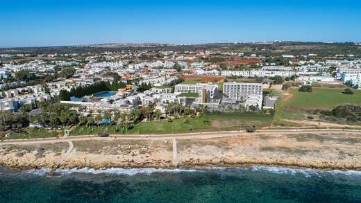 Het hotel ligt midden in Ayia Napa, omringd door palmbomen en mediterrane tuinen. Je loopt zo naar het strand en de gezellige badplaats ligt op een kwartier rijden. Vanuit het resort geniet je van uitzicht over de zee of de groene tuinen. De centrale ligging maakt het makkelijk om de Cypriotische kust te verkennen, maar je hebt ook alle rust en ruimte op het resort zelf.