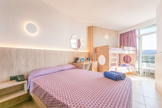 • Family Suite 4 (max. 4 personen, 25m²): hoofdslaapruimte met tweepersoonsbed en tweede slaapruimte met stapelbed, beide met eigen tv, uitsluitend in het Marte-gebouw