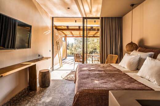 Het hotel biedt zeven verschillende kamertypes, allemaal ingericht in een eigentijdse boho-chic stijl met open badkamers en heerlijke tropical rain showers. De standaard Double Room with Garden View (27m²) heeft een ruim gemeubileerd balkon met uitzicht op de tuinen, terwijl de Double Room with Pool View (27m²) direct op het levendige hoofdzwembad uitkijkt. Reis je met z’n drieën of wil je wat meer ruimte? Dan is de Comfort Room (29m²) met tuinzicht perfect. Voor de mooiste uitzichten kies je de Panoramic Double Room (27m²) of Panoramic Comfort Room (29m²), beide met schitterend zicht over Kommeno Bay. Wil je echt verwend worden? De Premium Swim Up Pool Room (37m²) geeft je direct toegang tot een gedeeld zwembad vanaf je privéterras – hier stap je letterlijk vanuit bed het water in! De ultieme luxe ervaar je in de Premium Double Room with Private Pool (37m²), waar je beschikt over je eigen zwembad op een ruime veranda. Alle kamers hebben airco, flatscreen-tv, gratis WiFi, een safe, minikoelkast en koffie- en theefaciliteiten.