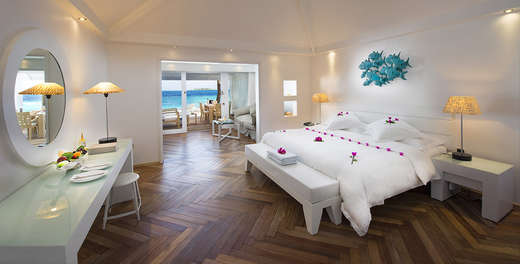 - Beach Front Junior Suites – ruimere suites aan de ondiepe lagune met aparte woonkamer, handgemaakt parket en op maat gemaakt rotan meubilair