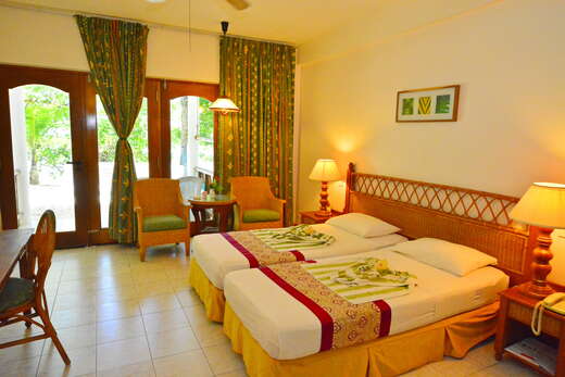• Deluxe Beach (26-30m²): Ruimere kamers op de begane grond direct aan zee met ligbad, gemeubileerd terras en dezelfde faciliteiten als de Superior