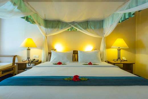 - Superior Villa (56 m²): semi-vrijstaande strandvilla’s met kingsize hemelbed of twee aparte bedden, privé zonneterras met daybed, en een semi-open badkamer met buitendouche. Perfect voor gezinnen door de mogelijkheid tot tussenverbindende kamers. Let op: de voordeel superior kamers liggen niet aan zeezijde.