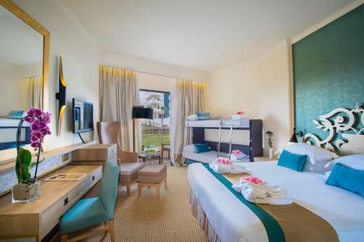 - Deluxe Family Room Sea View (30 m²) – familiekamer met kingsize bed, stapelbed en zeezicht