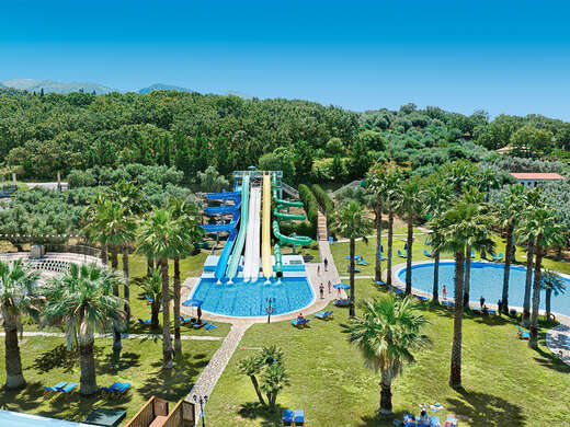 Naast vier heerlijke freshwater buitenzwembaden en het grote Grand Pool bij de Summer Houses, beschikt het resort over een indoor zwembad van 70m² in het spacentrum. Maar het échte hoogtepunt is het 40.000m² grote Costa Aqua Park – een van de grootste waterparken van Corfu! Tussen de palmbomen en bananenbomen vind je spectaculaire glijbanen zoals de Space Bowl (een enorme kom waar je met centrifugale kracht rondjes in draait), de Kamikazi Slide (razendsnelle afdaling met dramatische bochten), de Free Fall (bijna verticale mega-slide) en natuurlijk de ontspannen Lazy River waar je heerlijk op een band kunt dobberen. Voor jonge kinderen is er een speciaal kindergebied met Bozo Slides, Lazy Duck en een eigen Lazy River.
