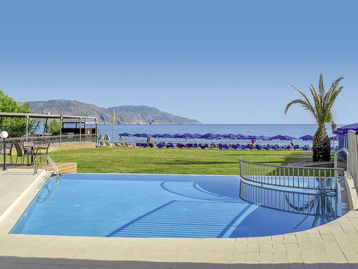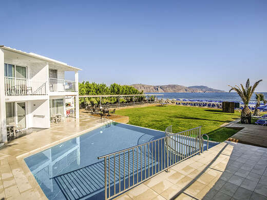 Het hotel ligt direct aan het zandstrand in de Kavros regio, waar je kunt genieten van eindeloos veel zon en zee. Op ongeveer 6 kilometer vind je het pittoreske Georgioupolis, een badplaats met een lange zandstrand, gezellige haven en een centrum vol authentieke restaurantjes en barretjes. Houd je van cultuur? Rijd dan naar de oude stad Rethymnon (25 minuten rijden), waar je door smalle straatjes dwaalt langs de Rimondi fontein, de Agios Frankiskos kerk en het archeologisch museum. Voor een dagje uit is ook Chania een aanrader (45 minuten rijden), met zijn sfeervolle Venetiaanse haven met vuurtoren uit de 15e eeuw en de wijk Splantazia waar je heerlijke mezedakia kunt proeven.