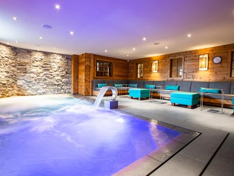 Het gloednieuwe zwembadcomplex is nog een groot voordeel van het hotel. Het verwarmde zwembad van 10×5 meter ligt half binnen, half buiten en is voorzien van grote openslaande ramen. In het bad vind je een waterval-paddenstoel, een tegenstroom-installatie en een jacuzzi-zone. De houten terrassen en solarium zorgen voor extra relaxmogelijkheden, en vanaf het rooftop-terras heb je een adembenemend uitzicht op de bergen. Dit zwembad is zowel in winter als zomer toegankelijk.