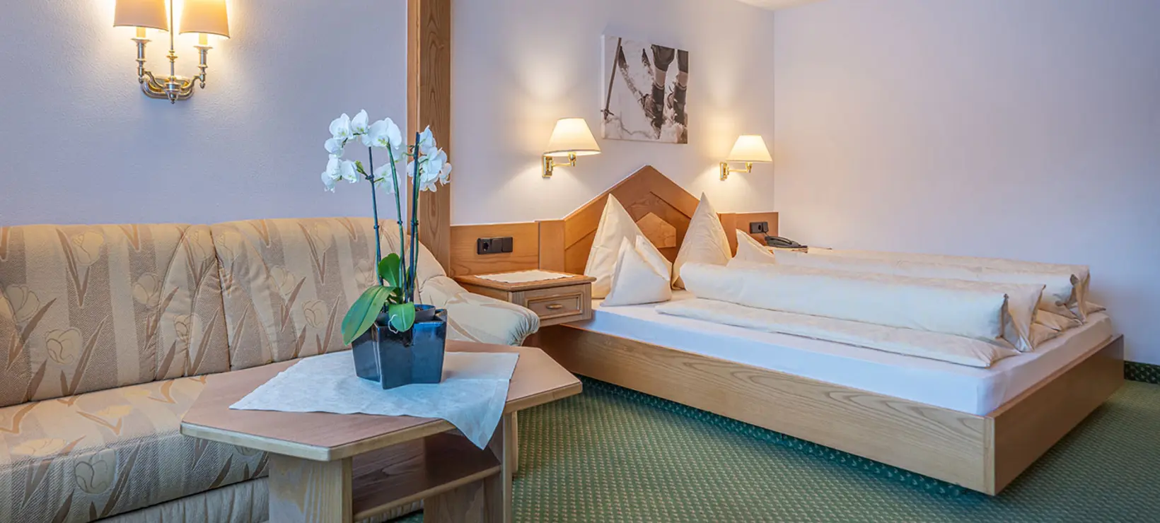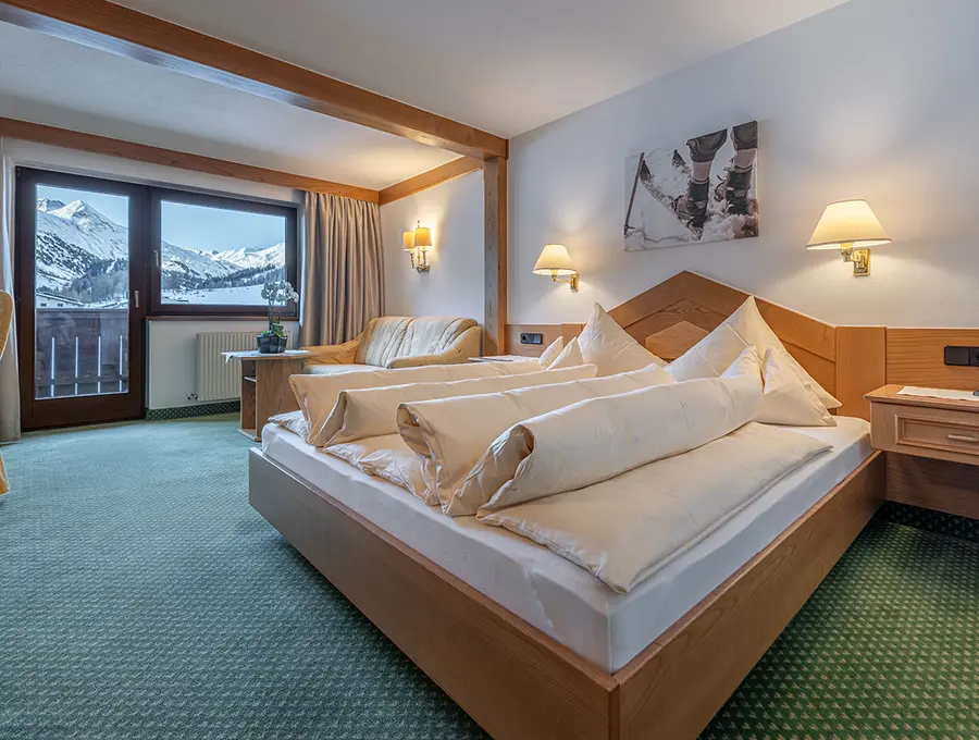 Nog meer ruimte vind je in de Steinadler Suite (40m²). Deze suite heeft een balkon op het oosten, zodat je ’s ochtends door de eerste zonnestralen wordt gewekt. De woonhoek heeft een fantastisch uitzicht en voldoende zitruimte voor het hele gezin.