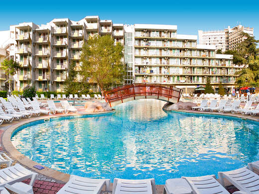Hotel Laguna Garden 4* ligt in het hart van het populaire Albena aan de Bulgaarse kust, op slechts 130 meter van het prachtige zandstrand. Dit gezellige 4-sterrenhotel beschikt over een mineraalwater zwembad, een uitgebreid Green All Inclusive pakket en toegang tot alle sportfaciliteiten die Albena te bieden heeft. Het hotel is omringd door een prachtige rozentuin en ligt vlakbij de gezellige winkelpromenade waar jullie een ijsje kunnen eten of een rondje botsboten kunnen rijden!