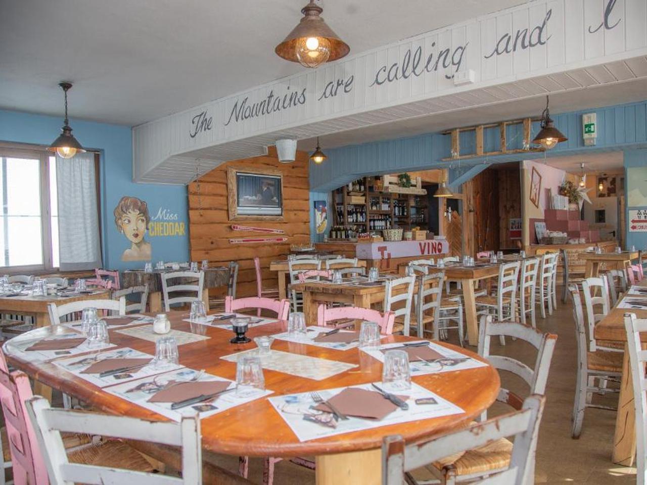 Het zonnige panoramische terras direct voor het hotel is een absolute highlicht. Hier geniet je van dat spectaculaire 180° uitzicht over Sportinia terwijl je comfortabel aan tafel zit. Het terras is perfect voor een lunchpauze op zonnige dagen, en het aanbod is verassend compleet: hot dogs, broodjes, luxe burgers van lokaal Fassone-vlees (een gerenommeerd Piemontees rundvleesras), en natuurlijk de beroemde pizza’s op 2000 meter hoogte. Je kunt hier zowel snel iets happen als uitgebreid lunchen, bediend aan tafel. Voor liefhebbers van lokale delicatessen: de combinatie van worst, kazen en lokale wijnen op dit terras met dat uitzicht is onvergetelijk.