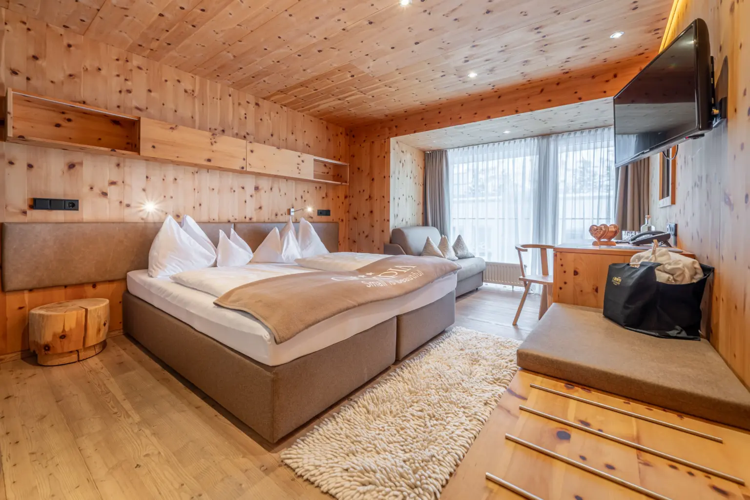 Voor gezinnen is de Comfort Room (36-38 m²) ideaal: met ruimte voor 3-4 personen, een balkon met gedeeltelijk bergzicht, dubbele wastafel en separate WC. De Spar-Zirben Kamer (26-28 m²) heeft fris geurend spar- en zirben hout met modern design, boxspringbedden en een balkon. Reis je alleen of met z’n tweeën? Dan is de Swiss Stone Pine Lodge Olympia Small (22 m²) een aanrader, met balkon op het zuiden, en lekker veel licht. De ruimste optie is de Panorama Suite (44-46 m²) voor 2-4 personen, met een groot balkon, whirlpool en douche, dubbele wastafel én gescheiden woon- en slaapgedeelte zodat je optimaal kunt genieten van het bergpanorama.