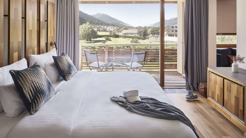 Speciaal voor gezinnen is er de Nassfeld Family Suite. Deze suite heeft een spectaculair bergzicht, een balkon en een open ontwerp met zithoek en eettafel. Het bijzondere is de tweede slaapkamer met stapelbed en eigen badkamer, perfect voor de kinderen die zo hun eigen plekje hebben.