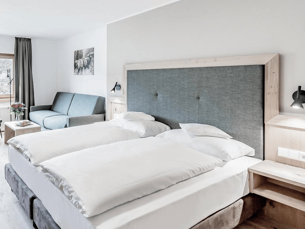 Hotel Zum Gourmet biedt vijf verschillende kamercategorieën, elk met een alpenmodern interieur en uitzicht op de indrukwekkende bergwereld rondom Seefeld. De kleinste optie is de Single room van 17m², perfect ingericht voor solo-reizigers die hun eigen ruimte waarderen. Je beschikt hier over een comfortabel eenpersoonsbed, een zithoek, bureau en badkamer met douche. Vanaf €90 per nacht heb je je eigen uitvalsbasis. Voor stellen zijn er twee doucheroom-varianten beschikbaar. De Superior double room beslaat 23 tot 28m² en is voorzien van tapijtvloer, een ruime badkamer met douche of bad, en biedt uitzicht op de natuurrijke omgeving. Prijzen starten vanaf €169 per nacht. Wie iets meer ruimte en luxe zoekt, kiest voor de Deluxe double room met 30 tot 40m². Deze moderne kamer heeft een houten vloer of tapijt, een comfortabele zithoek waar je samen de skidagen kunt bespreken, en een badkamer met douche of bad. Het bergzicht en de ruimere oppervlakte maken dit een fijne upgrade voor €189 per nacht. Deze kamer is geschikt voor 2 tot 4 personen.