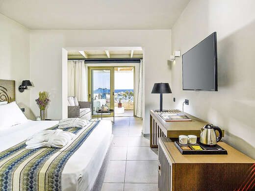 - Junior Suite – Ruime open-plan slaap- en woonkamer met kingsize bed en een privéterras met uitzicht op zee, het zwembad én de tuin