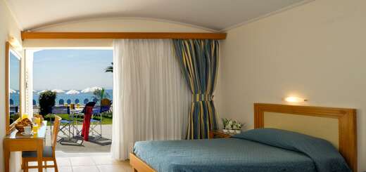 - Suite – De beste kamer van het resort, met uitzicht op de Saronische Golf, een Queen-size bed, een lounge hoek en een luxe badkamer