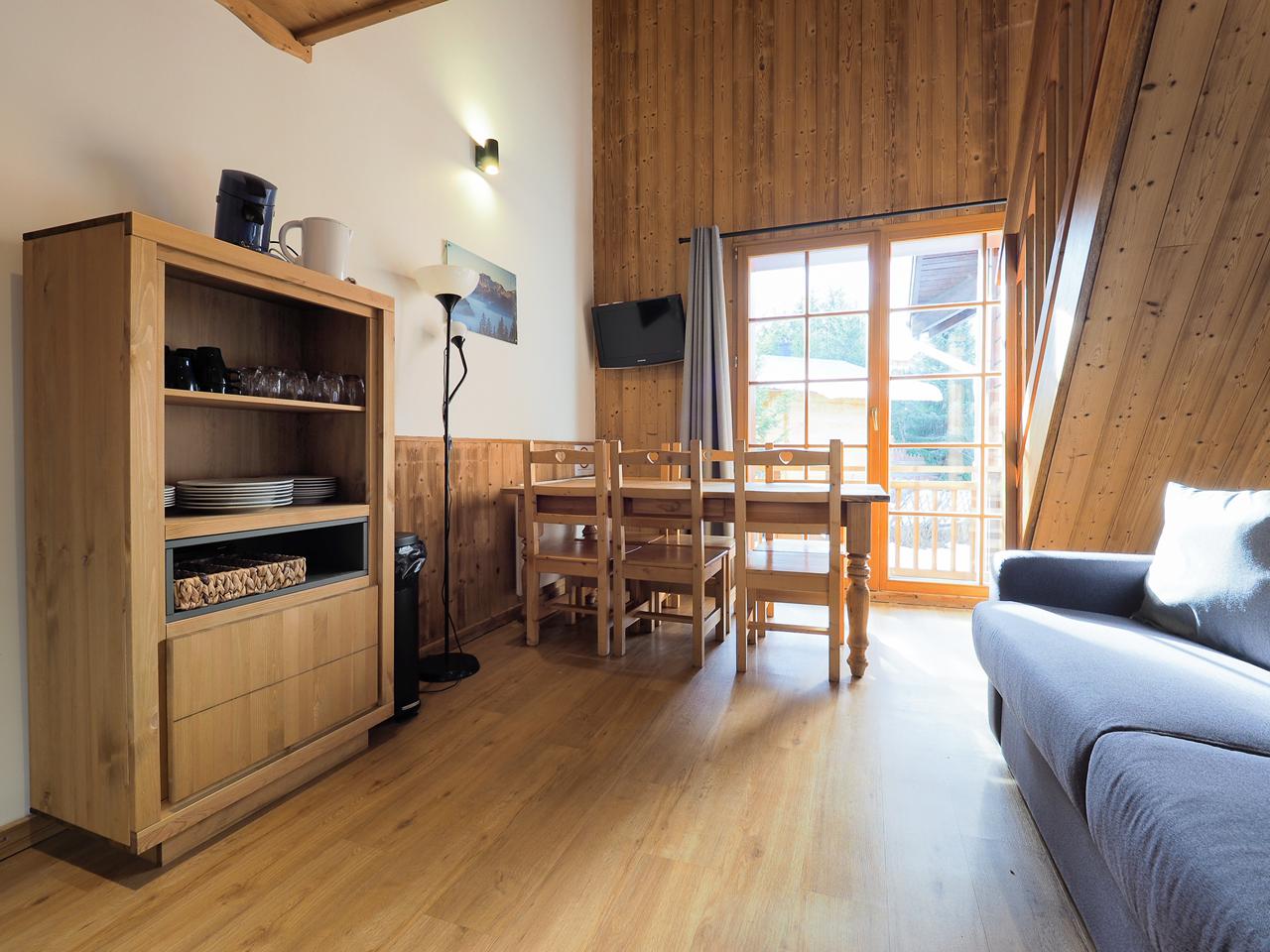 De Résidence Aiguille Lodge biedt drie types 2-kamerappartementen, allemaal met balkon en volledig uitgeruste keuken. Bij alle appartementen is gratis televisie aanwezig. Eindschoonmaak is niet inbegrepen – je ruimt de boel zelf op of boekt dit bij (€70-€80 per verblijf). Lakenpakketten kosten €13,50 per week, handdoeken €9,50 per pakket. Je betaalt ter plaatse een borg van €300 per appartement via creditcard.