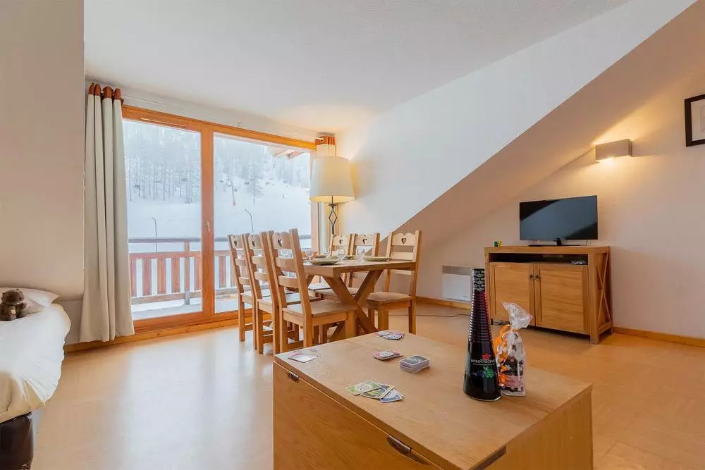 De accommodatie ligt midden in het skigebied Les Orres. Dit is een zelfstandig domein in de Zuid-Franse Alpen en je hebt de ‘Skipas Les Orres’ nodig. De dichtstbijzijnde lift is de Préclaux-stoeltjeslift, op slechts 20 meter afstand, waardoor je ’s ochtends direct kunt vertrekken en ’s middags terug skiet naar de deur (ski-in/ski-out). Les Orres is niet via liften verbonden met andere grote gebieden, zoals het nabijgelegen La Forêt Blanche (Risoul/Vars); je skiet exclusief binnen het 100 km tellende gebied van Les Orres zelf.