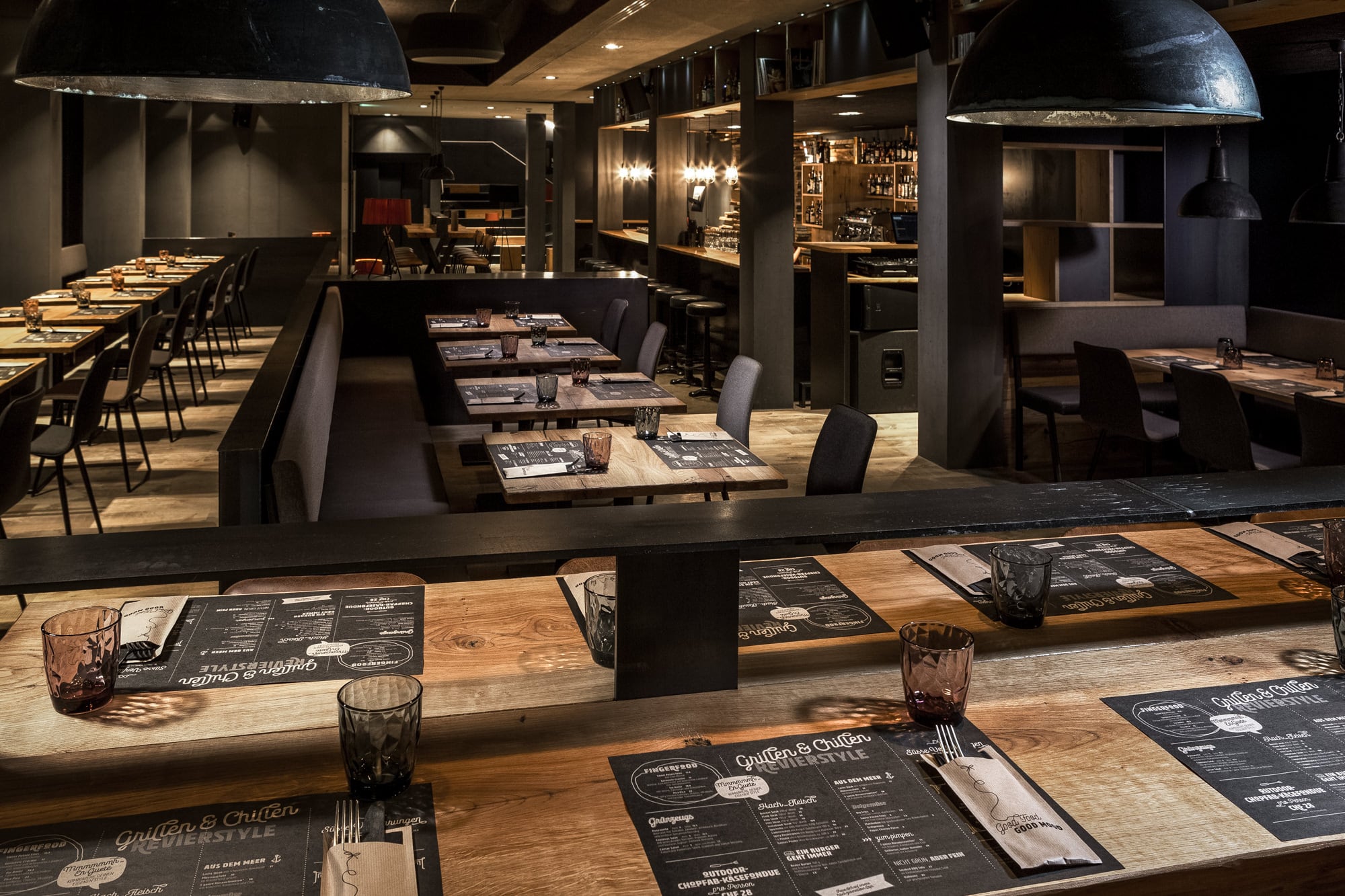 Het restaurant draait om ongecompliceerde, mediterraanse keuken van hoge kwaliteit. Het hart van de keuken is de Josper Grill, waar gerechten worden bereid met aandacht voor duurzame en kwalitatief sterke ingrediënten. De menukaart is overzichtelijk maar gevarieerd genoeg om elke avond iets nieuws te proberen. De eetruimte heeft lange tafels die uitnodigen tot gezelligheid. Hier schuif je aan met medegasten, een ervaring die vaak leidt tot spontane gesprekken en nieuwe contacten. Liever wat privacy? Dat kan ook – er zijn genoeg plekken waar je rustig kunt eten. De prijzen zijn eerlijk en de sfeer is warm en informeel. De bar heeft een indrukwekkende selectie van meer dan 20 verschillende Craft Beers, geschonken via een van de modernste tapinstallaties van Graubünden. Voor vrouwen is er dagelijks van 17:00 tot 20:00 uur de Prosecco flatrate: onbeperkt prosecco voor 22 Zwitserse frank. Op vrijdag en zaterdag is er live muziek of een DJ, wat de bar omtovert tot het centrum van après-ski en avondvermaak. Daarnaast organiseert de lodge regelmatig Grill & Chill events met live acts, dus er is altijd wel iets te beleven.