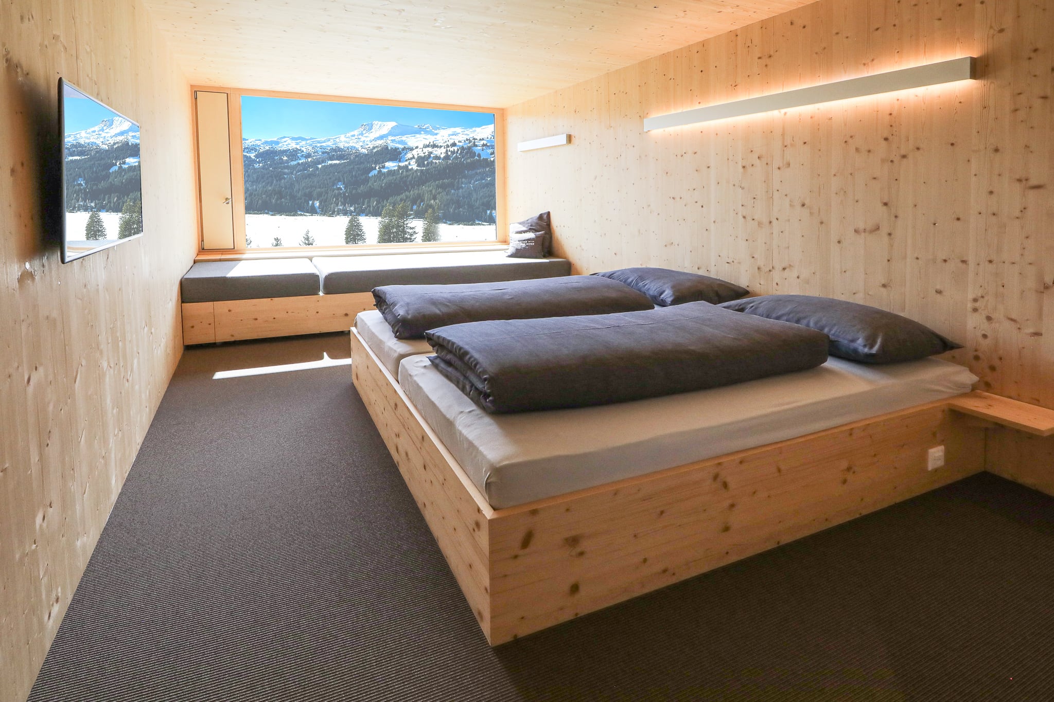 Revier Mountain Lodge Lenzerheide bevindt zich op 150 meter van de Rothorn-kabelbaan en op dezelfde afstand van de piste. De laatste bocht van je skiafdaling brengt je direct voor de deur van het hotel. Je skikluis zit in de beveiligde, camera-bewaakte ski- en fietsruimte, dus je hoeft je uitrusting nergens anders naartoe te sjouwen. Voor verhuur of reparaties hoef je niet de deur uit – beide services vind je in het hotel zelf. Het dorpscentrum van Lenzerheide ligt op ongeveer 1500 meter loopafstand, de dichtstbijzijnde bushalte op slechts 100 meter. De lodge combineert moderne industriële uitstraling met veel hout en enorme panoramaramen. Vanuit elk raam kijk je uit op het Heidsee en de besneeuwde bergtoppen van de Lenzerheiden. De sfeer is ongedwongen en gericht op wat echt telt: slapen, skiën, eten, drinken en samenzijn met vrienden.