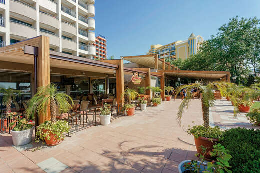Het hotel ligt op slechts enkele meters van het privéstrand, waar je gebruikmaakt van gratis ligbedden. De boulevard loop je zo over en binnen een kwartiertje sta je in het bruisende hart van Sunny Beach. Toch geniet je hier van een rustiger sfeer dan in het centrum, ideaal als je ’s avonds lekker wilt slapen na een dag vol zon en zee.