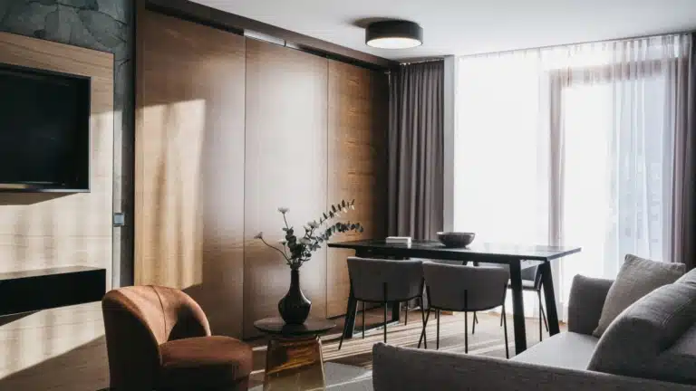 De One-Bedroom Suite (45m², max 3 personen) heeft een aparte slaapkamer en woonkamer die je met een schuifdeur kunt scheiden, plus hoekbalkons met direct zicht op de Festkogl. De Junior Penthouse Suite (45m², max 2 personen) heeft een inloopkast en luxe badkamer met regendouche en XL ligbad, en een enorm terras met panoramisch uitzicht op de bergen.