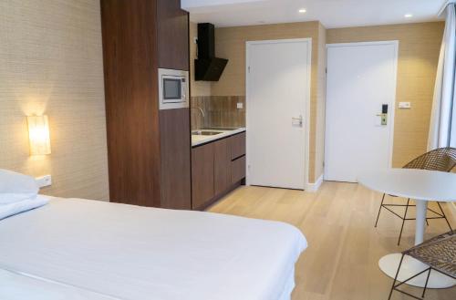 - Appartement 26,5 m² – compact en compleet ingericht met tweepersoonsbed, eettafel met twee stoelen, flatscreen tv, kitchenette met kookplaat, koel-vriescombinatie en combi-magnetron, en een badkamer met regendouche.