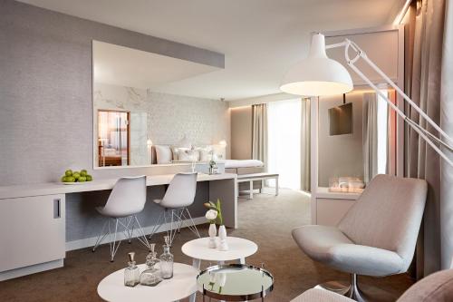 - Suite Silver en Gold (beide 62m²): apart woon- en slaapgedeelte met keukenblok (zonder kookfaciliteit), minibar, bluetooth audio-systeem en open badkamer met bubbelbad en inloop regendouche