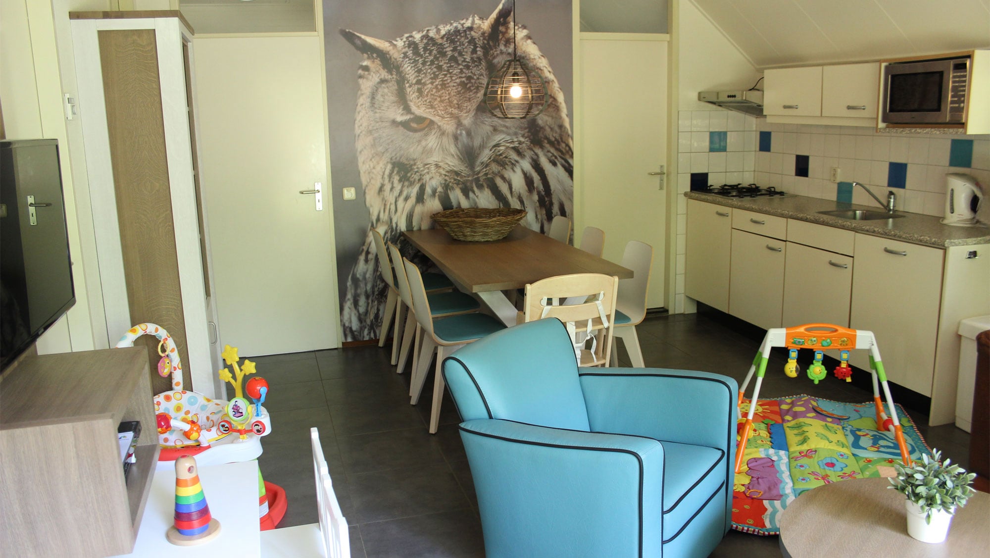 Een kindercottage is speciaal ontworpen voor gezinnen met peuters en kleuters en beschikt over uitgebreide voorzieningen die je thuis ook hebt. Standaard vind je er een kinderbedje of ledikant, kinderstoel, babybox en vaak ook een commode met aankleedkussen en babybadje. Voor de veiligheid zijn er traphekjes bij trappen, kindveilige stopcontacten en soms kindersloten op keukenkastjes. De kinderslaapkamer heeft meestal een stapelbed of hoogslaper met vrolijke kleuren en thematische decoratie. Veel cottages beschikken over een aparte speelruimte met speelgoed, spelletjes of zelfs een speeltafel. Praktische extra’s zoals kinderservies, toiletverkleiner en een kikkerdouchekop maken het verblijf compleet.