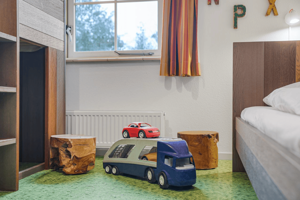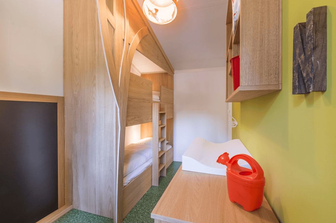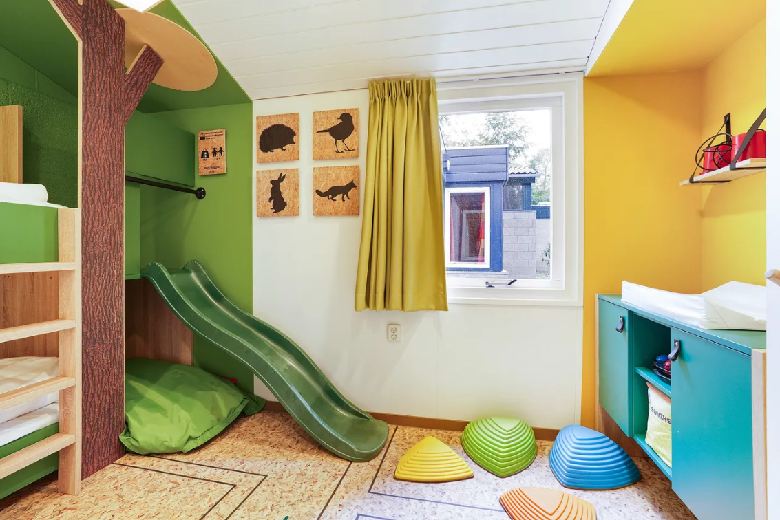 Luxere varianten hebben bijzonderheden zoals een privé-speeltoestel in de omheinde tuin, een glijbaan vanuit de kinderkamer of een eigen trampoline. Bij sommige accommodaties zijn de bedden bij aankomst al opgemaakt en ontvangen kinderen een welkomstpakket met spelletjes of kleurplaten. De ligging is vaak strategisch bij speeltuinen gekozen, zodat kinderen veilig buiten kunnen spelen terwijl ouders vanaf het terras toezicht houden.