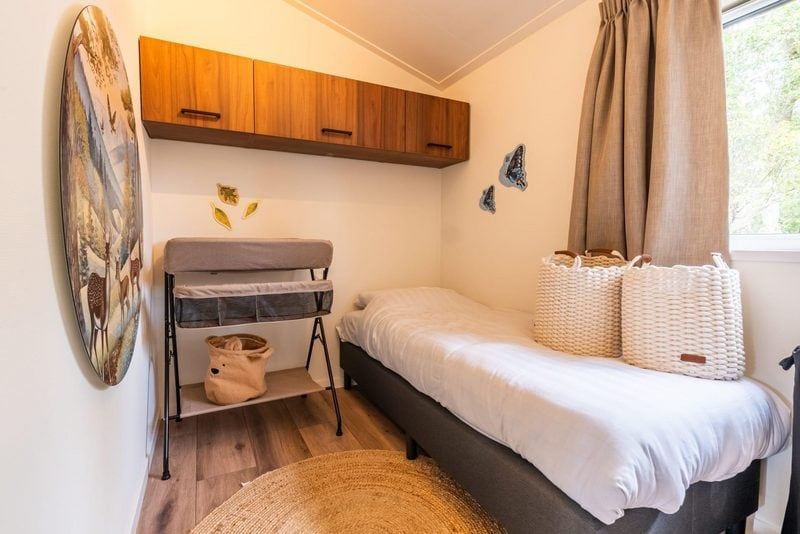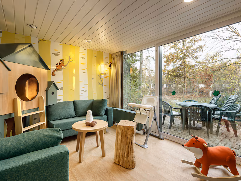 De Module Special Kids huisjes op TopParken Recreatiepark ’t Gelloo zijn speciaal ontworpen voor gezinnen met jonge kinderen. Het grootste pluspunt? Direct voor de deur vind je een gedeelde speeltuin waar de kinderen veilig kunnen ravotten terwijl jij vanuit je terras toezicht houdt. De kinderkamer is extra vrolijk ingericht en heeft een stapelbed plus een uitschuifbed (5-persoons variant). Handig: de bedden zijn al opgemaakt bij aankomst en je krijgt een gratis welkomstpakket. Je parkeert de auto direct bij je huisje, ideaal met kleintjes en bagage.