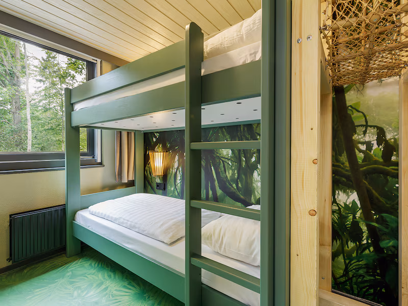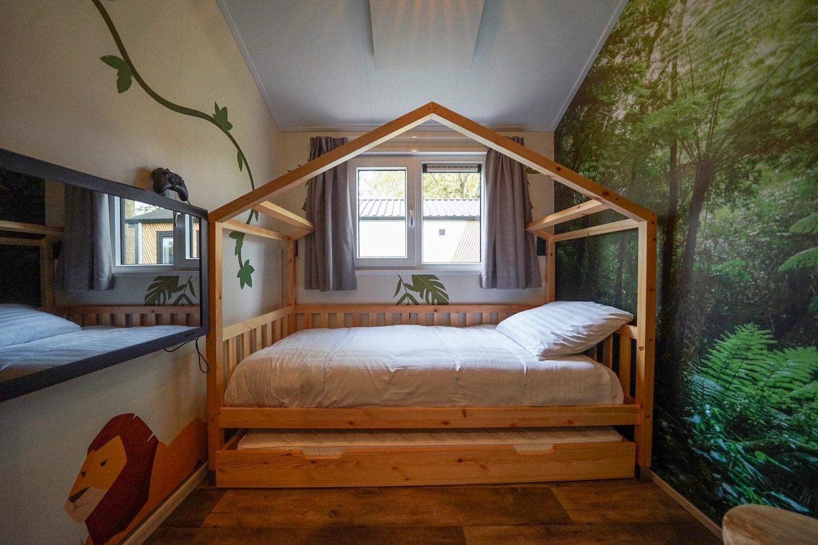 De kindercottages op EuroParcs Kaatsheuvel zijn échte droomhuisjes voor gezinnen. De Kids Adventure Cottage heeft een spectaculaire junglethema kinderkamer met muurschilderingen van wilde dieren, tropisch fotobehang en een uniek houten huisjesbed met uitschuiflade voor een tweede slaapplaats. Het absolute hoogtepunt is de game-spiegel met Nintendo Switch waar kinderen urenlang mee kunnen spelen. De Kids Cottage beschikt over een stapelbed van 1,60 meter (geschikt voor kinderen tot 8 jaar) en heeft eveneens een eigen Nintendo Switch. De cottages staan slim gegroepeerd in een kringetje met een speeltuintje met schommels in het midden, volledig zichtbaar vanuit je woonkamer.