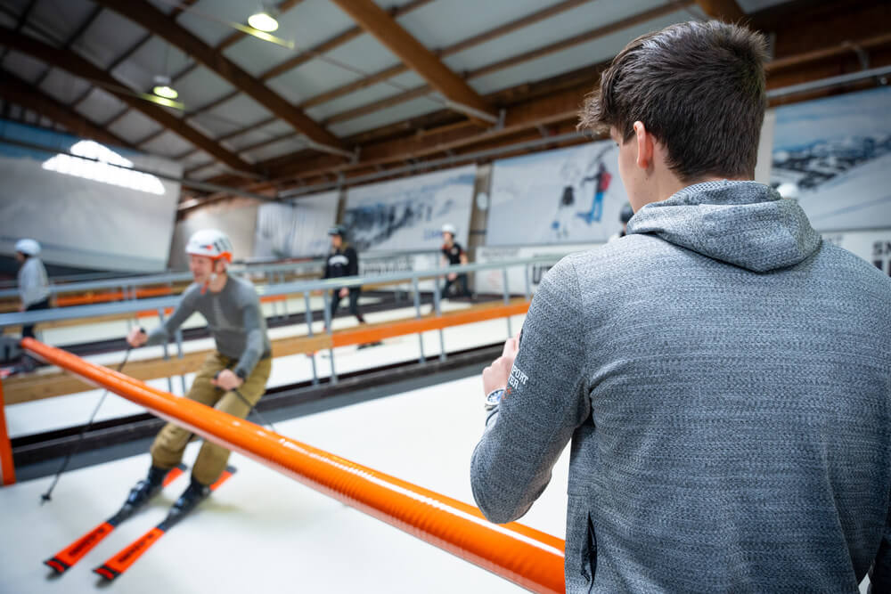 Portes Du Ski in Ridderkerk werkt op twee geavanceerde rolbanen met PMTS-methode: direct parallel skiën vanaf les één, maximaal twee personen per baan. Een sterke technische focus, kost minder kracht; niet duwen, maar geduwd worden. Veel persoonlijke begeleiding, eigen wax- en slijpservice en specialistische trainingen voor zowel kinderen als gevorderde skiërs met of zonder beperking.​