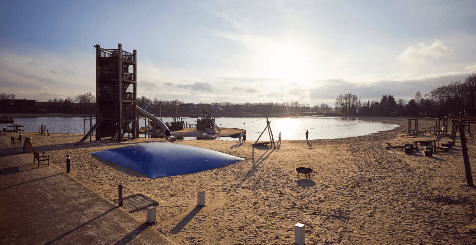 Hof van Saksen in Nooitgedacht is een luxe vijfsterren resort in Drenthe met een centraal gelegen recreatiemeer. Dit natuurlijke zwemmeer heeft meerdere zandstrandjes waar je gratis gebruik kunt maken van ligbedden. Het meer is maximaal 2,5 meter diep, met een afgebakende zone bij de drijflijn van slechts 75 centimeter diep – ideaal voor jonge kinderen. Bij het meer vind je een uitgebreide waterspeeltuin en strandspeeltuin met een klimtoren en klimwand. Uniek is het pontje waarmee je over het water kunt varen, en op een speciale plek mag je zelfs vissen.