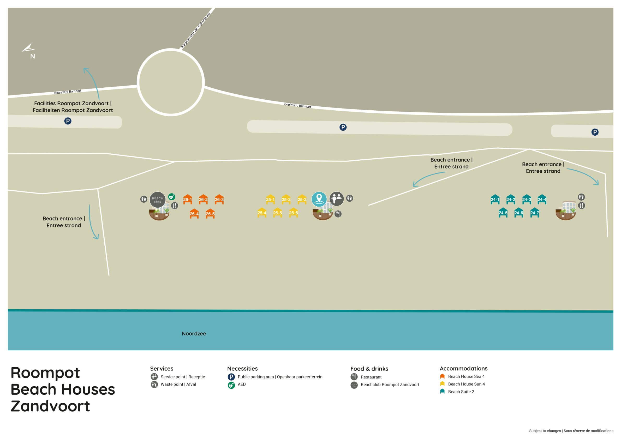 Landal Beach Houses Zandvoort ligt aan Boulevard Barnaart 25 direct op het strand van Zandvoort. Het park bevindt zich in de badplaats Zandvoort in Noord-Holland, ongeveer 20 kilometer ten westen van Amsterdam. De accommodaties staan letterlijk met de voeten in het zand en bieden direct toegang tot het brede strand van de Noordzee. Het park grenst aan het Nationaal Park Zuid-Kennemerland, een uitgestrekt natuurgebied met duinen en heide. Vanuit het park loop je zo het centrum van Zandvoort in met zijn boulevard, winkels en restaurants.
