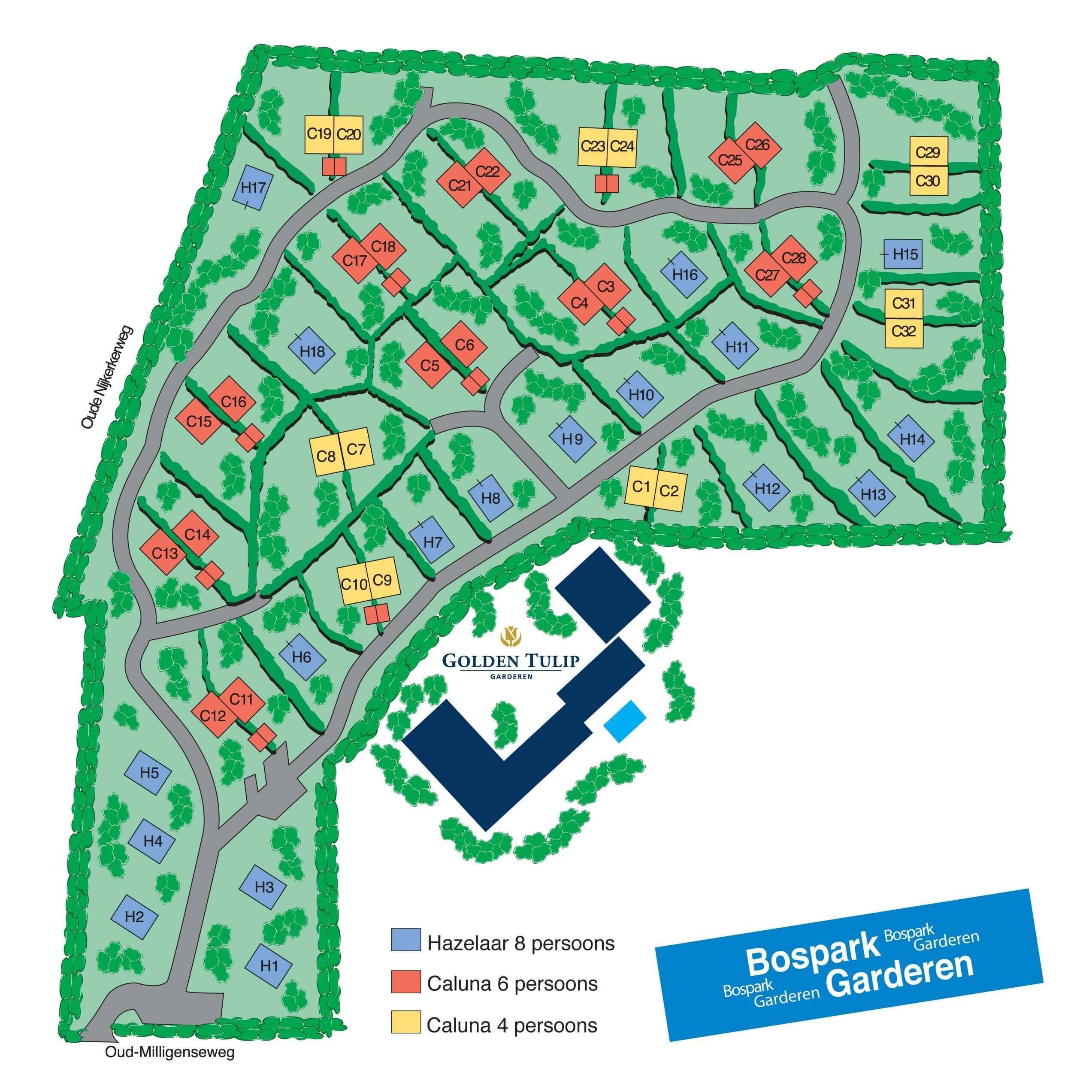 Bospark Garderen ligt midden op de Veluwe in de provincie Gelderland, verscholen in de bossen vlak naast het dorpje Garderen. Het vakantiepark bevindt zich strategisch tussen Apeldoorn en Amersfoort in, op het adres Oud Milligenseweg 62 in Garderen. Het park vormt een complex met het naastgelegen WestCord Hotel de Veluwe en ligt direct tegenover Klimbos Garderen. De ligging biedt toegang tot het afwisselende Veluwse landschap met heidevelden, bossen, landgoederen en zandvlakten. Het Speulderbos grenst aan het park, en Nationaal Park De Hoge Veluwe ligt in de nabije omgeving.