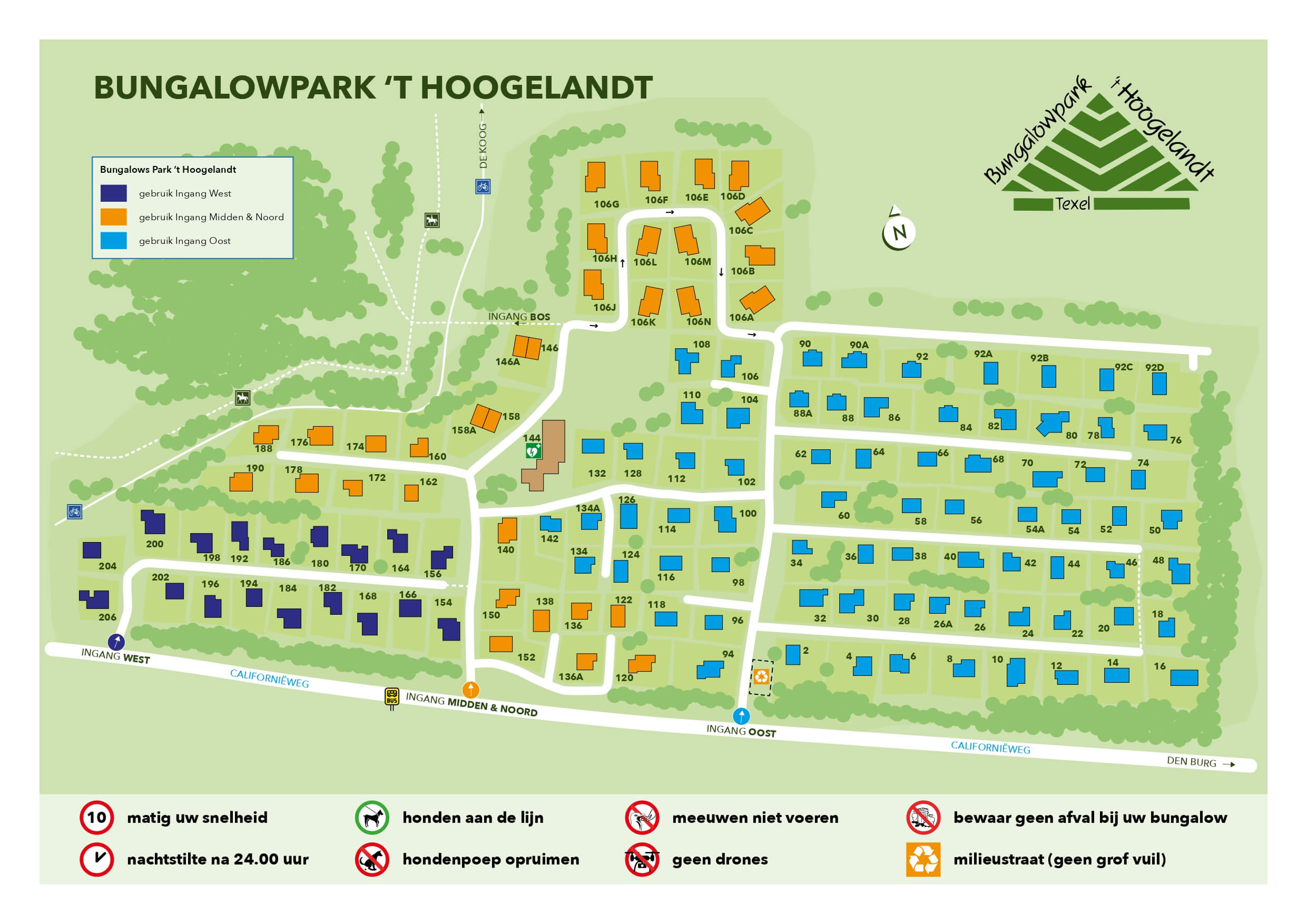 Bungalowpark ’t Hoogelandt ligt aan de Californiëweg in De Koog op Texel. Het kleinschalige park bevindt zich aan de rand van Nationaal Park Duinen van Texel en grenst direct aan het Texelse dennenbos. De Koog centrum ligt 3 kilometer noordelijker, terwijl het Noordzeestrand op 1,8 kilometer afstand te bereiken is. Den Burg, het grootste dorp van Texel, bevindt zich op 4,5 kilometer van het park. Door de ligging tussen bos en duinen ervaar je als gast optimale rust en privacy.