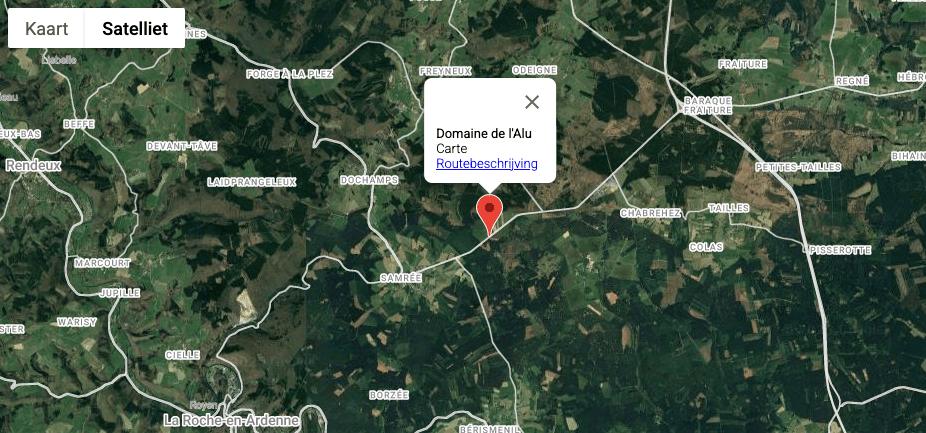 Domaine De L’Alu ligt in het dorpje Samrée, gemeente La Roche-en-Ardenne in de Belgische provincie Luxemburg. Het 30 hectare grote landgoed bevindt zich 10 km van het centrum van La Roche-en-Ardenne. Vanuit het park bereik je charmante Ardense stadjes als Houffalize, Bastogne en Durbuy binnen enkele kilometers. Het domein ligt middenin de Belgische Ardennen, omgeven door bossen en natuurgebied. De ligging is zeer rustig en landelijk, met het centrum van Samrée op slechts 1 km afstand.