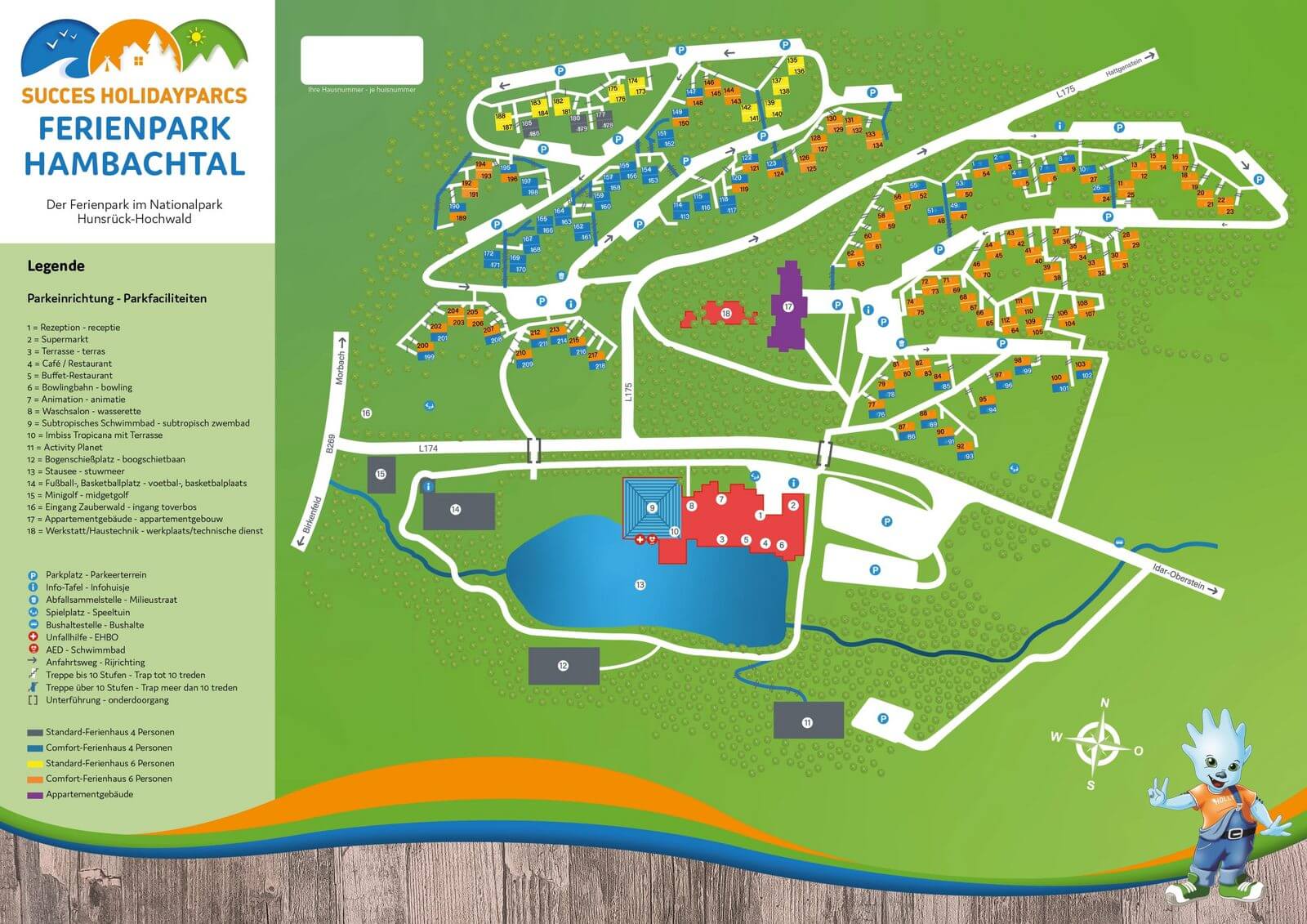 Vakantiepark Hambachtal ligt in het heuvelachtige landschap van de Duitse Hunsrück met prachtige vergezichten. Dit park heeft een grote transformatie doorgemaakt waarbij vooral de gerenoveerde comfort huisjes echt indruk maken. Deze moderne accommodaties zijn ruim opgezet met drie verdiepingen, voorzien van een complete keuken met inductiekookplaat en vaatwasser, en hebben zelfs Nederlandse tv-zenders. Het uitzicht vanaf je terras over de bergen is spectaculair, vooral ’s ochtends bij het wakker worden! Let wel op want dit park is absoluut niet geschikt als je slecht ter been bent of met kleine kinderen in een kinderwagen reist. De huisjes liggen op verschillende terrassen tegen de heuvel, en je moet flink wat trappen op en af om bij de centrale voorzieningen te komen. De huisjes liggen aan de andere kant van een doorgaande weg, bereikbaar via voetgangerstunnels. Met de auto kun je wel vrij dicht bij je accommodatie parkeren, wat het in- en uitladen makkelijker maakt. Kies je voor een standaard huisje in plaats van een comfort huisje? Dan moet je rekening houden met gedateerde inrichtingen.