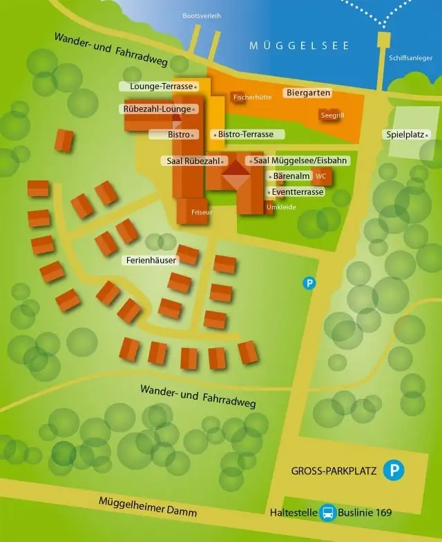 Ferienpark Rübezahl ligt in Berlin-Köpenick aan de zuidoostelijke rand van Berlijn, direct aan de oever van de Müggelsee, het grootste meer van de Duitse hoofdstad. Het park bevindt zich op het adres Müggelheimer Damm 143 en ligt ongeveer 20 minuten rijden van het centrum van Berlijn. Het dichtstbijzijnde S-Bahnstation ligt op enkele kilometers afstand. Vanuit het park bereik je gemakkelijk de historische binnenstad van Köpenick, de Müggelturm en het uitgestrekte natuurgebied Berliner Stadtforst. De ligging combineert de rust van een groene omgeving met water met de nabijheid van de bruisende hoofdstad.
