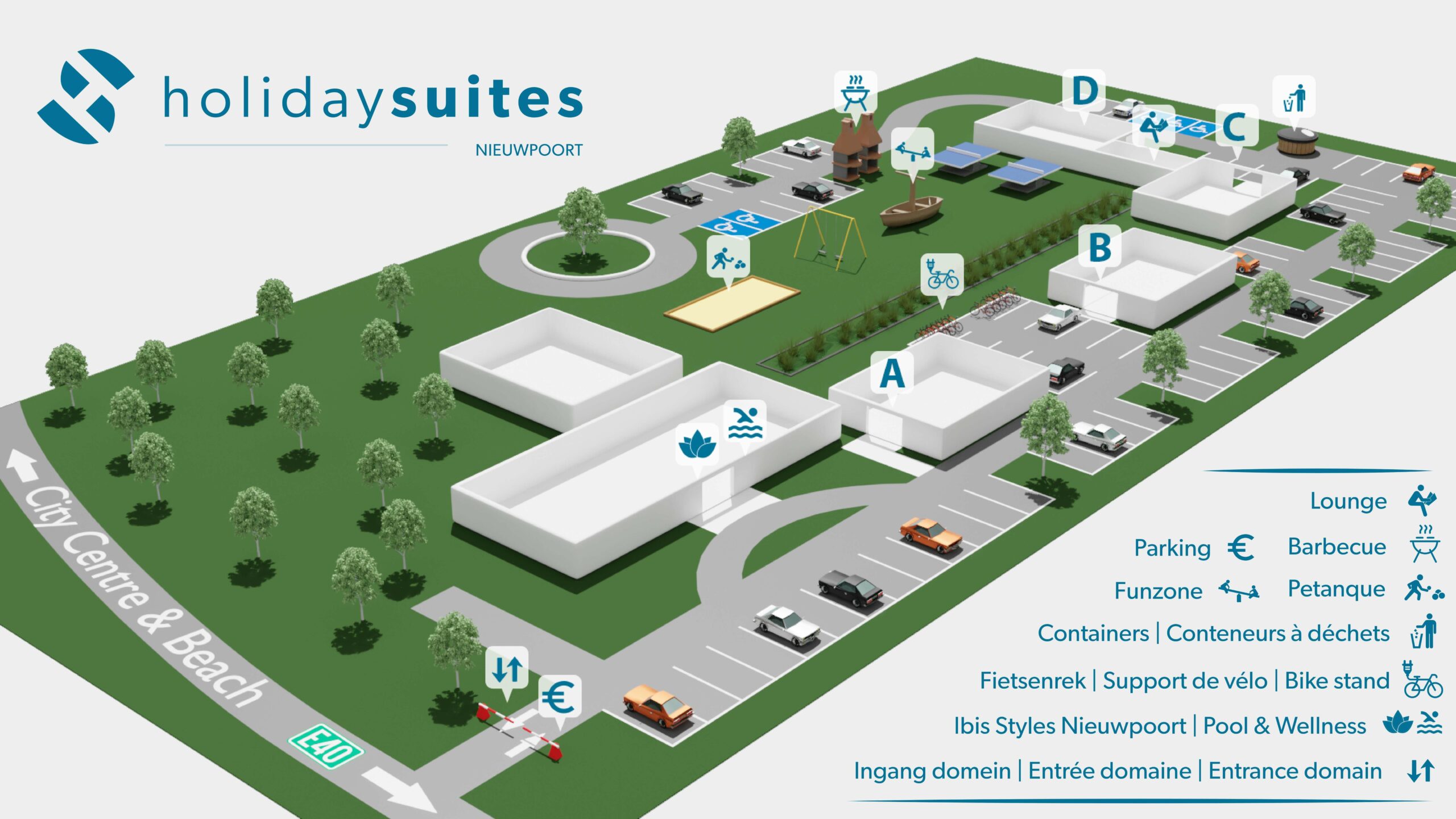 Holiday Suites Nieuwpoort ligt direct aan de Belgische kust in de badplaats Nieuwpoort, West-Vlaanderen. Het park bevindt zich nabij Brugge en Duinkerke, en op 18 kilometer van Plopsaland De Panne. De accommodatie ligt in de buurt van het unieke natuurreservaat De IJzermonding, waar de IJzer rechtstreeks in de Noordzee uitmondt en zoet en zout water elkaar ontmoeten. Dit creëert een bijzonder microklimaat met slikken, schorren en duinen. Het park ligt ongeveer 20 minuten wandelen van het strand en de tram.