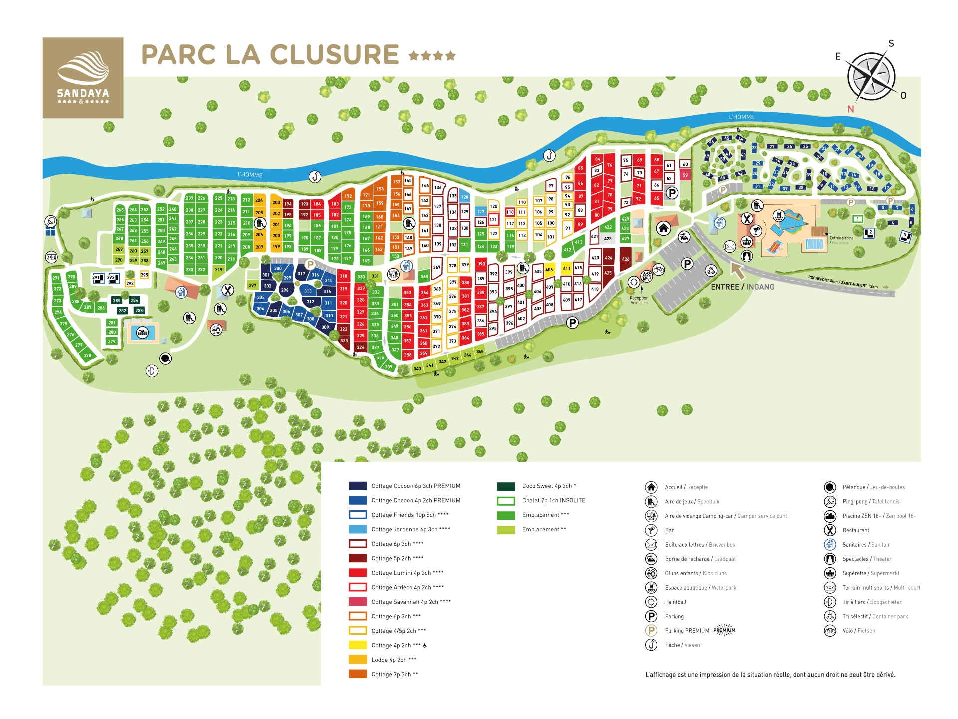 Sandaya La Clusure ligt in het hart van de Belgische Ardennen in Tellin, provincie Luxemburg. Het park bevindt zich op 30 Chemin de la Clusure en heeft een unieke ligging aan de oevers van het visrijke riviertje de L’Homme dat over een kilometer langs het terrein stroomt. De camping ligt strategisch tussen de toeristische dorpjes Saint-Hubert en Rochefort, waarbij Bure-Tellin op slechts 2 kilometer afstand ligt. Het park grenst direct aan uitgestrekte wandelgebieden met bewegwijzerde routes en ligt nabij de beroemde grotten van Han-sur-Lesse.