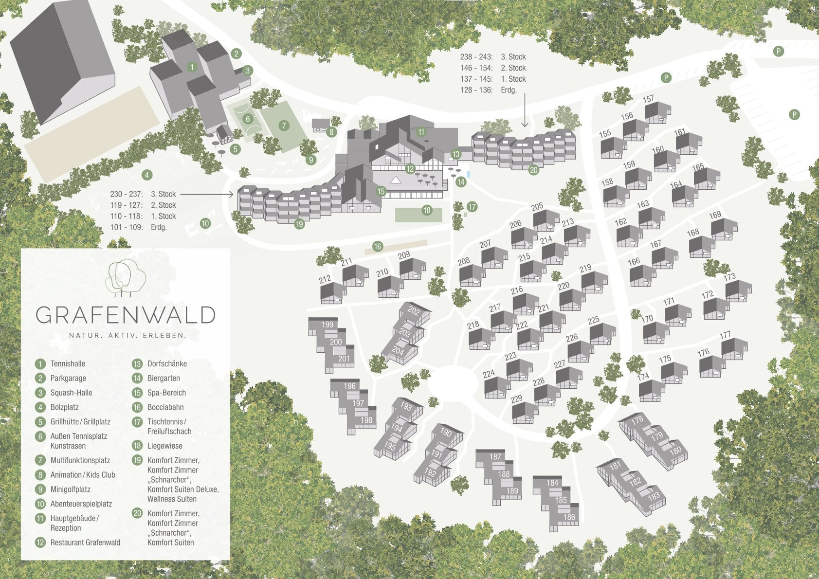 Sporthotel Grafenwald ligt midden in de Vulkaneifel in Daun, Rheinland-Pfalz, omringd door het bos waaraan het resort zijn naam dankt. Het resort bevindt zich ongeveer 5 kilometer van het centrum van Daun en 20 kilometer van Gerolstein. Vanuit Utrecht is het zo’n 245 kilometer rijden. Het hotel ligt in een groene, rustige omgeving direct in het bosgebied van de Grafenwald. De ligging is bijzonder omdat het resort zich uitstrekt door het bos heen, waardoor gasten vanaf hun terras met wat geluk zelfs herten kunnen spotten. Het resort ligt in de onmiddellijke nabijheid van de beroemde Dauner Maare, drie iconische kratermeren die het gezicht vormen van zowel Daun als de gehele Vulkaneifel.