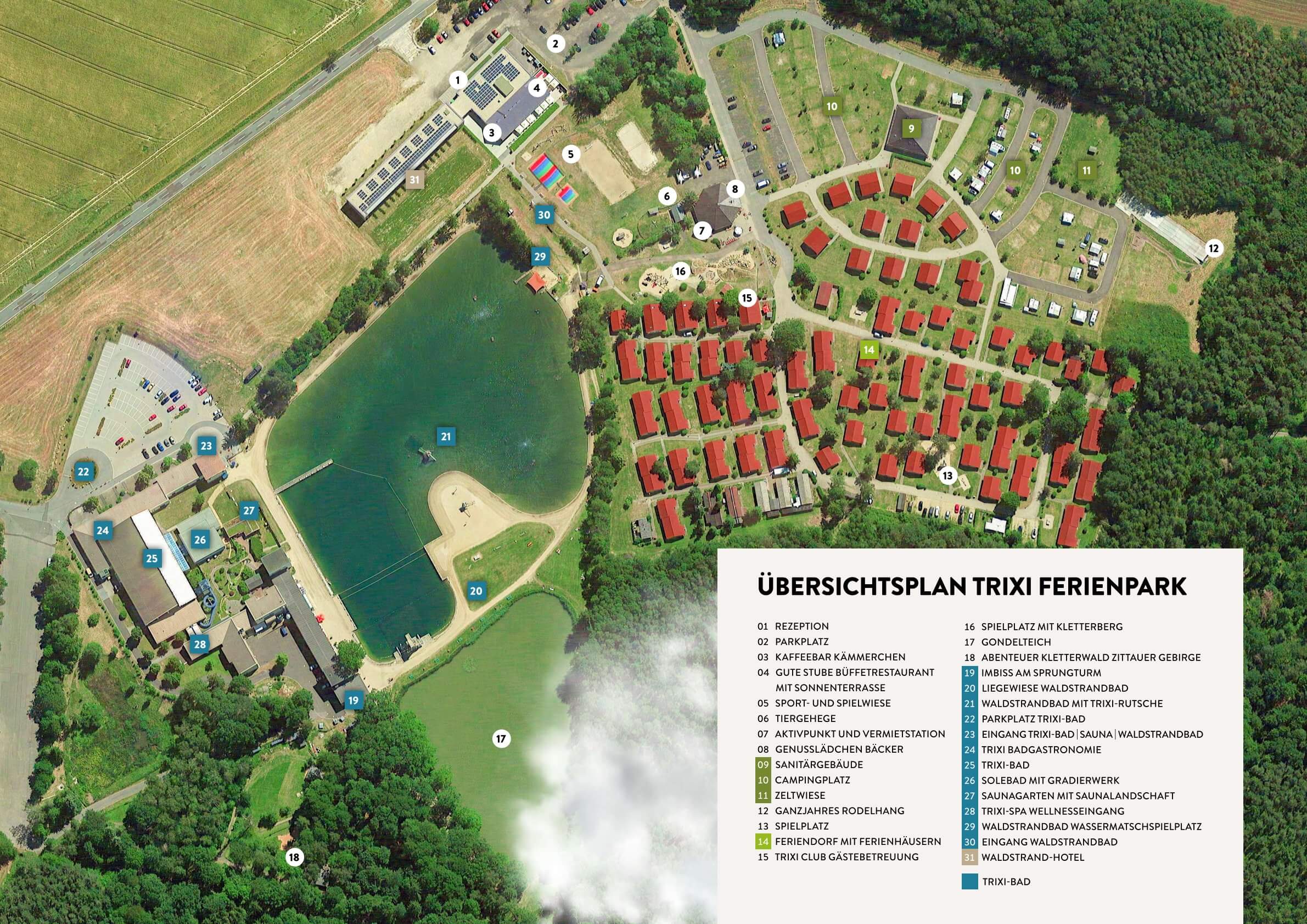 Het Trixi Bad is een subtropisch zwemparadijs met een 60 meter lange Black-Hole-glijbaan, een 25 meter zwembaan (4 banen), een 32°C warm peuterbad met miniglijbaantje en waterfontijnen, whirlpool (33°C), solebad gevuld met echte sole uit Bad Muskau, dampfkamer, infraroodcabine en rustzones. Het bad is dagelijks open van 10:00 tot 22:00 uur. Het saunalandschap (1700 m²) heeft drie sauna’s tussen 55°C en 97°C: de Finse sauna (90°C) met elk uur een opgietceremonie, en de bijzondere Blockhaus-Sauna (90°C) waar tot drie keer per dag een zelfgemaakte knoflook-opgiet plaatsvindt – daarna neem je samen met de saunameister een frisse duik in het Waldstrandbad. Verder zijn er een soletherme, dampfcabine, en dagelijks vanaf 13:00 uur toegang tot het koude water van het Waldstrandbad voor afkoeling (met zwemkleding). Elke woensdagmiddag tot 18:30 uur is de sauna exclusief voor dames.
