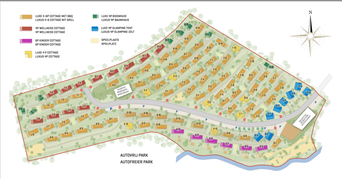 Voor gezinnen met jonge kinderen is er de 4+2-persoons Kinder Cottage, die helemaal is afgestemd op kids. Het terras heeft een eigen glijbaan (!) en vlakbij ligt een beek waar kinderen op warme dagen kunnen spelen. Direct naast de cottage vind je een nieuwe speeltuin. De cottage heeft verder alle voorzieningen van de luxe variants, inclusief twee slaapkamers, een slaapbank en kindvriendelijke meubels.