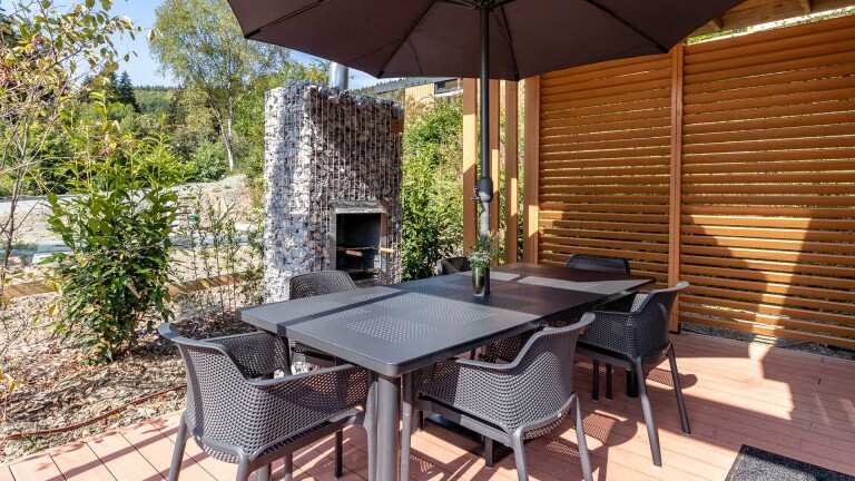 Hou je van wellness? Dan is de 4-persoons Wellness Cottage met Hottub echt iets voor jou. Deze cottage heeft niet alleen alle luxe van de standaard cottages, maar ook een houtgestookte hottub op het terras én een dakterras met panoramisch uitzicht over de omgeving. Je klimt via een buitentrap naar boven en wordt beloond met een spectaculair zicht over het Sauerland.