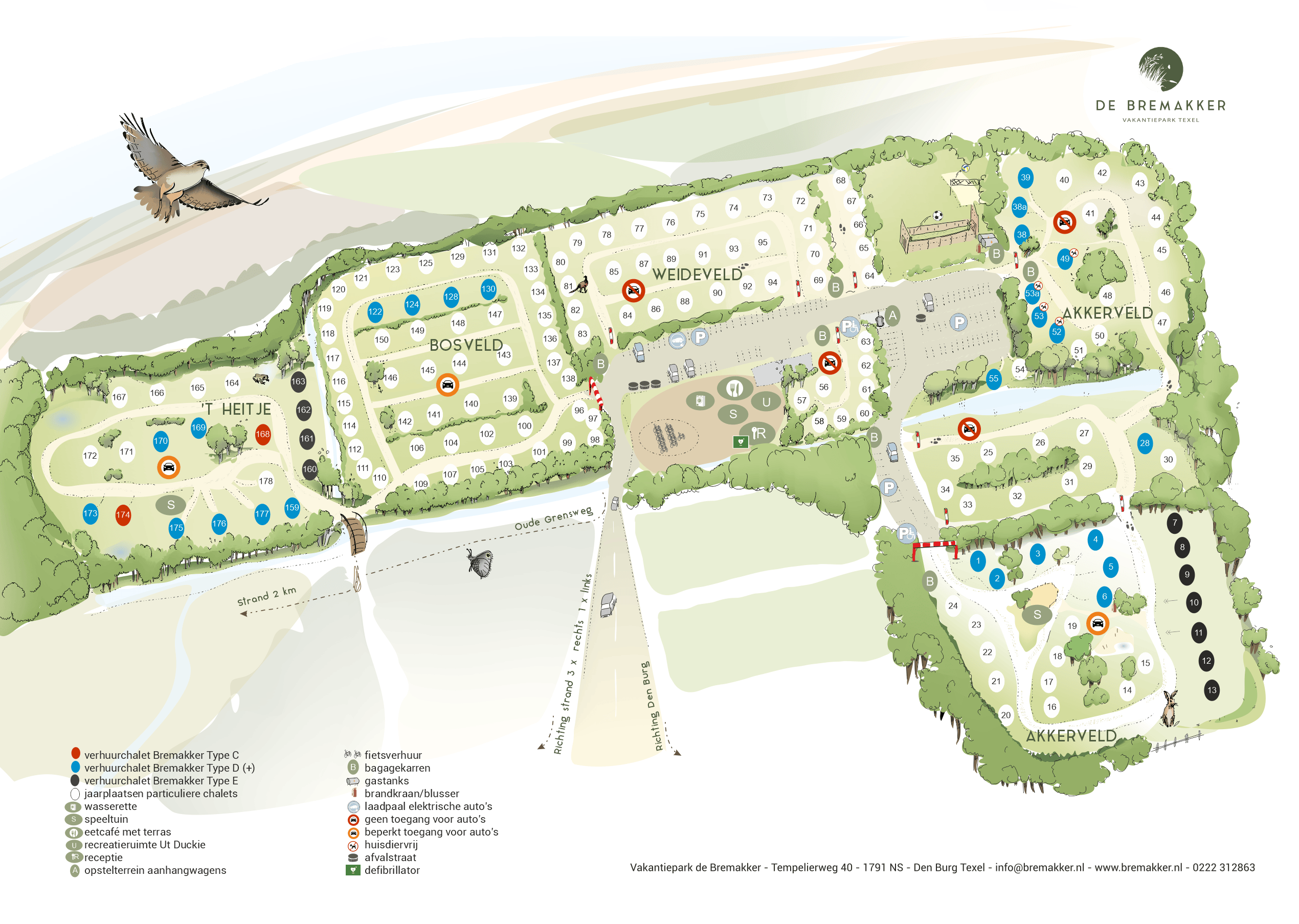 Vakantiepark De Bremakker ligt centraal op het Waddeneiland Texel aan de Tempelierweg 40 in Den Burg. Het park grenst direct aan het Nationaal Park De Duinen van Texel en is omgeven door dennenbossen. Het strand bevindt zich op 1,5 kilometer afstand, terwijl zowel badplaats De Koog als het centrum van Den Burg beide op 3,5 kilometer liggen. Deze centrale ligging maakt het park een uitstekende uitvalsbasis om heel Texel te verkennen, met de natuur letterlijk om de hoek en de zee binnen fietsafstand.